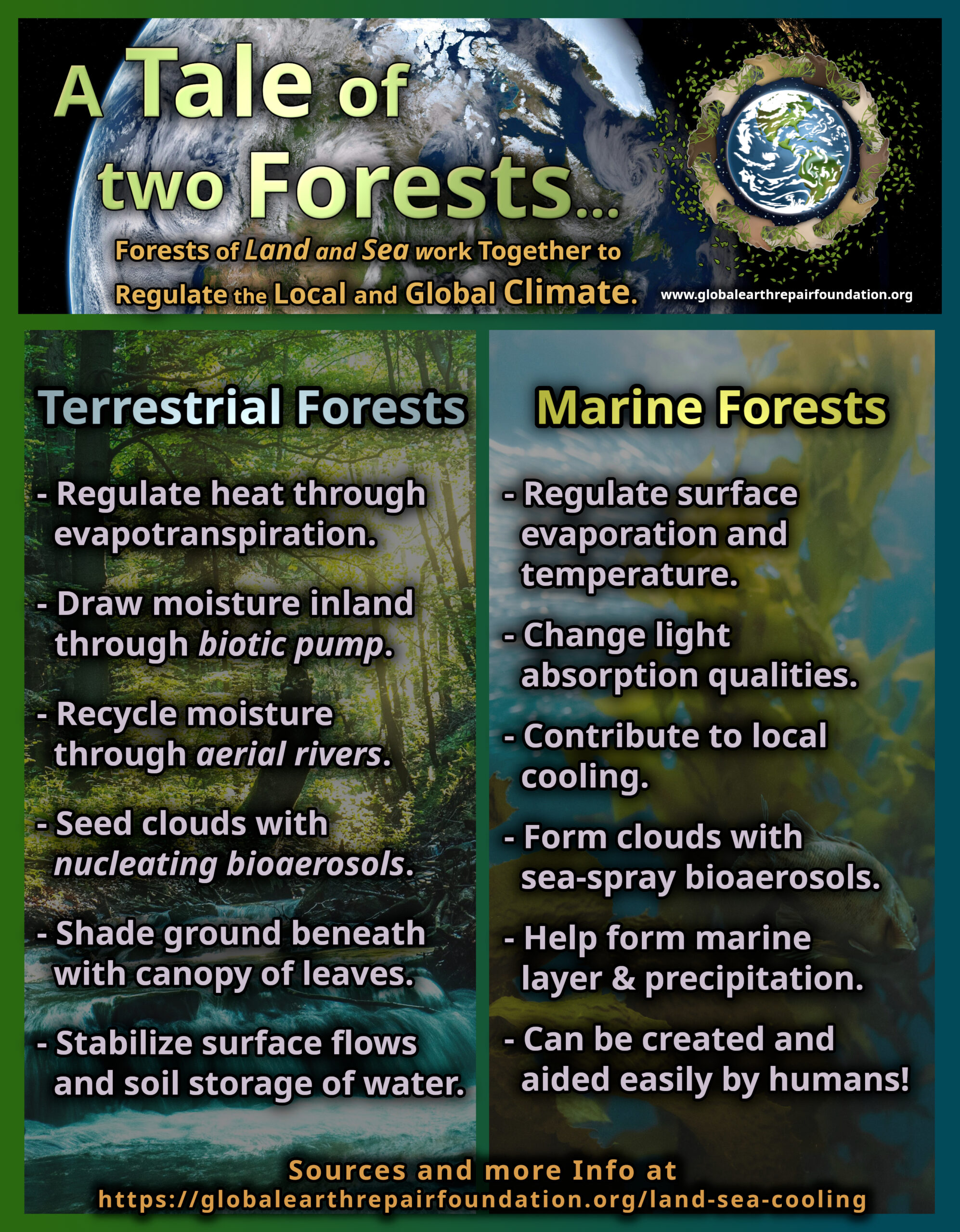Living ecosystems cool the planet in so many ways – yes, they sequester carbon, but it’s so much more multidimensional than that. Forests both marine and terrestrial influence temperature, cloud formation and precipitation en masse by directly manipulating the physical interplay of energy, water, and living aerosol particulates (like spores, micro-algae, and pollen). These virtuous feedback loops include but are not limited to only-recently-hypothesized effects like the “biotic pump” and “aerial rivers” use evapotranspiration, photosynthesis and bio-aerosols to nucleate clouds and control the states of water, resisting the march of entropy over sea and land and maintaining the balance of climate locally – and when bio-regional systems can be repaired and linked together, we get positive global change. In other words, forests of both kinds are the planetary thermostat, and the good news is – we can improve the chances of both to thrive!